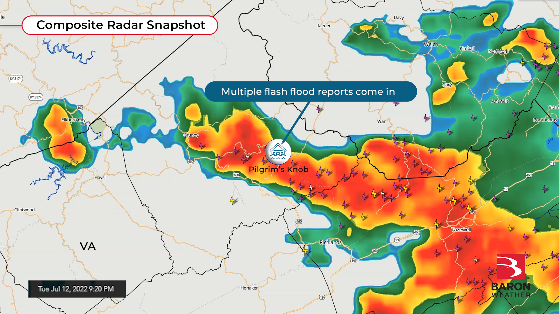多个 暴洪报告 来自布坎农县的消息,包括 100 多所房屋被淹,朝圣者之丘附近有 40 人下落不明。